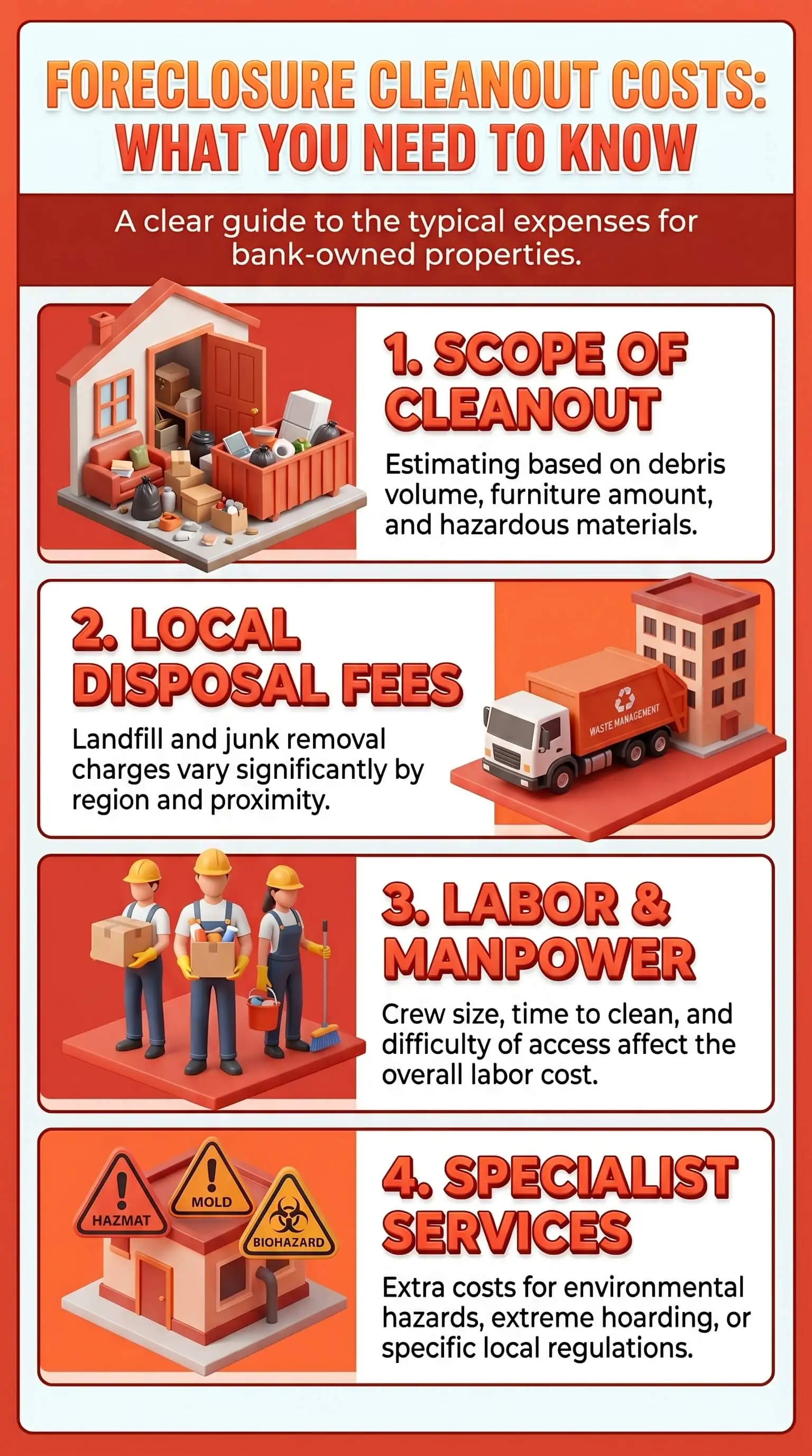 Here's our take after running this work for years. If you buy REO at any volume, lock in a per-square-foot framework with one or two preferred contractors and stop re-bidding every property. The pricing certainty saves 8% to 12% versus three-bid procurement on each property, the turn time drops by days because you skip the bidding cycle, and the contractor learns your standards (photo-doc formatting, biohazard handling, lockbox protocols, dump-receipt requirements) so the second pass shrinks. Build cleanout into your rehab pro-forma at $2.50 to $3.50 per square foot as your default, then revise after walk-through.