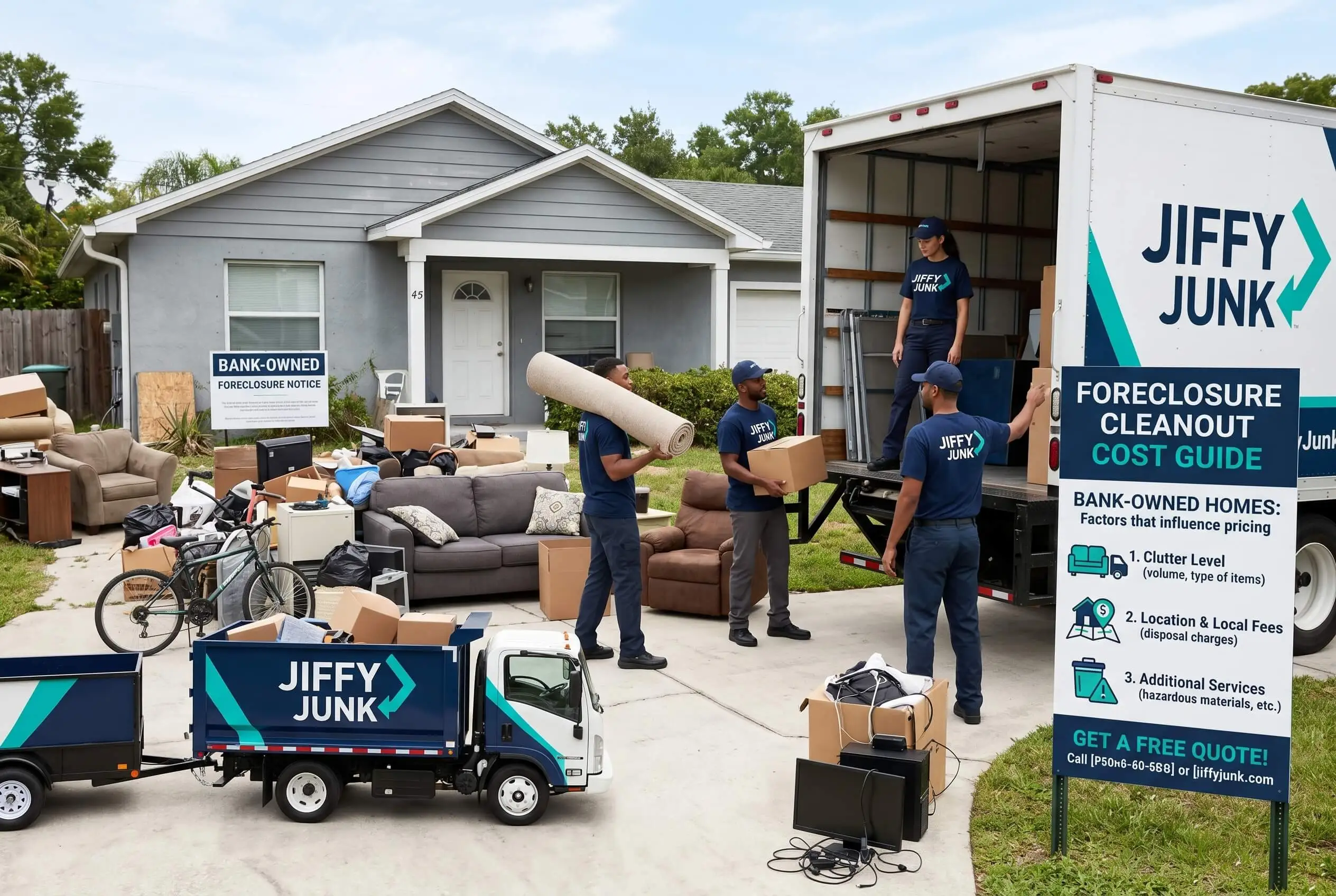 Across the cleanouts our Jiffy Junk team has handled for REO buyers and small servicers, the smartest way to manage estate foreclosure cleanouts pricing is to identify the full scope before the quote is finalized. A thorough walk-through helps uncover hidden debris, attic storage, locked closets, and possible floor damage early, giving families and property professionals a clearer, more accurate budget. Budget worst case at the offer stage, then walk the property yourself before you accept any quote, opening every door, popping every attic hatch, keying every locked closet, and pulling up corner rugs that look like they're hiding floor damage. Dial the quote back once you've seen what's actually inside.