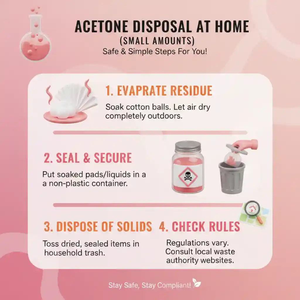 Some local rules allow limited at-home disposal methods for very small quantities, especially when acetone is fully dried or evaporated safely. If your local guidelines permit it, here’s the safest approach.